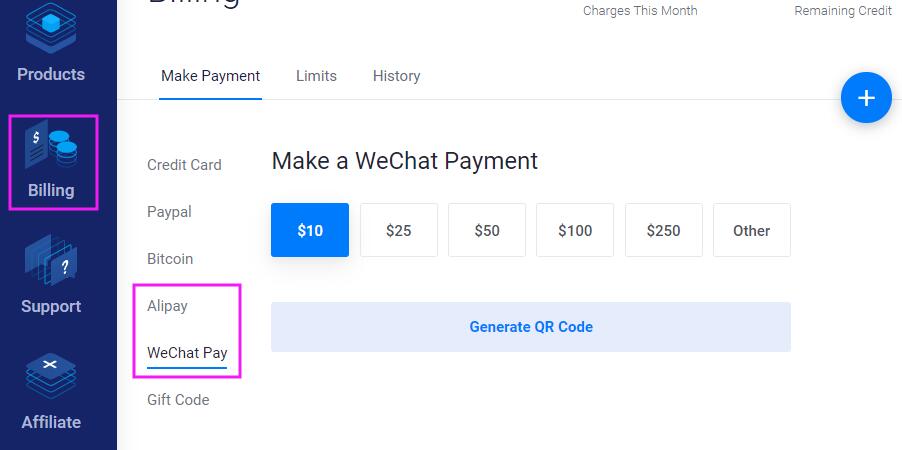 注册完成登录后。在管理后台左边点击billing,如下图,先给帐户充值10美元,支付方式可选支付宝或者微信。