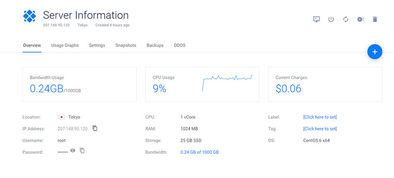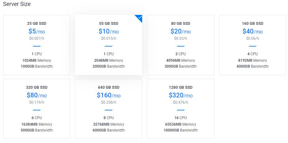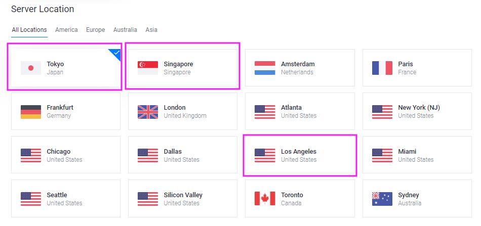 充值完成后点击右上角的加号开通一台服务器,vultr实际上是折算成小时来计费的,比如服务器是5美元1个月,那么每小时收费为5/30/24=0.0069美元 会自动从账号中扣费,只要保证账号有钱即可。如果你部署的服务器实测后速度不理想,你可以把它删掉(destroy),重新换个地区的服务器来部署,方便且实用。因为新的服务器就是新的ip,所以当ip被封时这个方法很有用。当ip被封时,为了保证新开的服务器ip和原先的ip不一样,先开新服务器,开好后再删除旧服务器即可。1、选择机房位置,目前国内速度比较好的三个机房是日本、新加坡、洛杉矶 ,日本的ping值基本是100左右,新加坡和洛杉矶的ping值大概在200左右 。这一步根据自己的需要选择适合的机房。