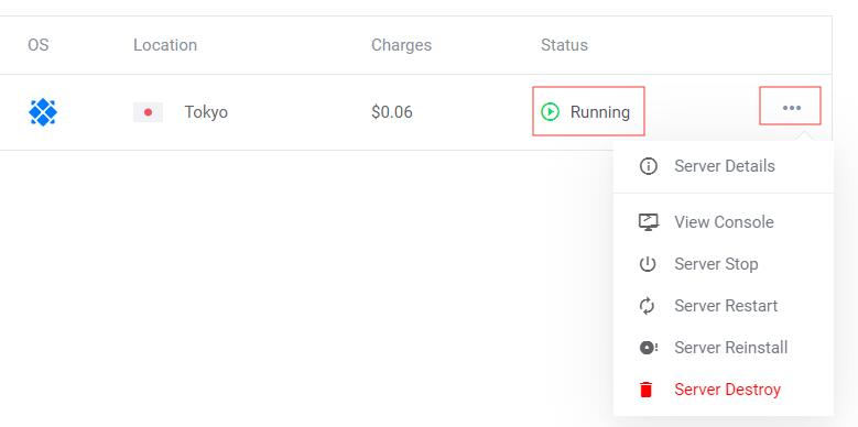 然后大概得等个1分钟左右的时间安装系统,安装完成后,状态会显示正在运行,点击后面三个点,选择第一个SERVER DETAILS查看服务器信息