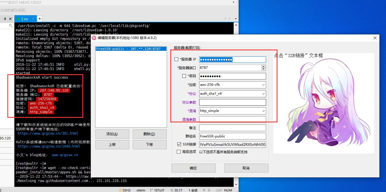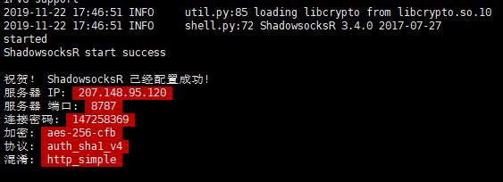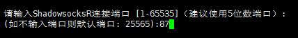 然后输入端口后,按任意键开始安装,等 一会,出现下面界面说明安装成功了,记好下面的信息。一会连接SSR需要用上。