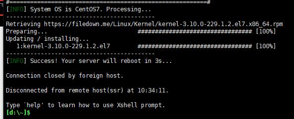 等待内核更换完毕后系统会自动重启并断开连接。然后重新连接,执行下面命令。