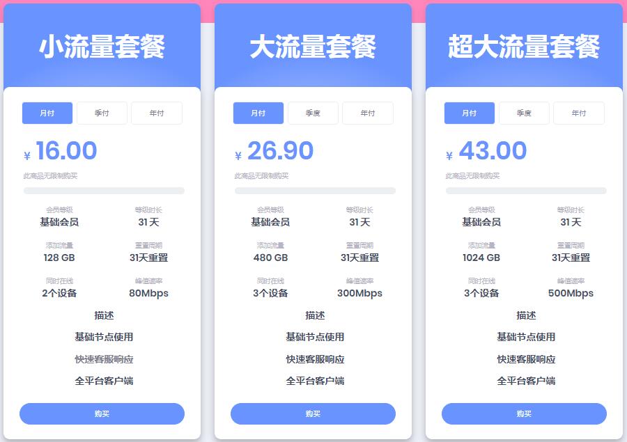 大流量:26.9CNY/mo:'480GB流量 支持3设备在线 限速300Mbps'