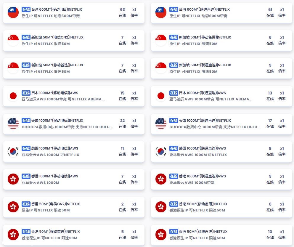 全球线路全面,香港(HK,HKBN,CN2)、日本(IIJ,NTT),台湾(HiNet,TFN)、新加坡、美国(GIA,NCP)、韩国(AWS)、俄罗斯(KHV)、等线路可选。
