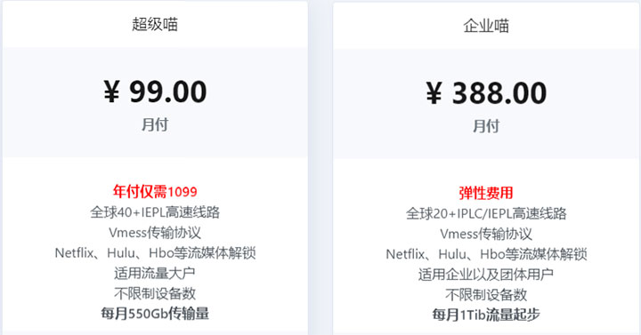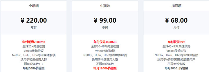萌喵加速(Nirvana)套餐列表