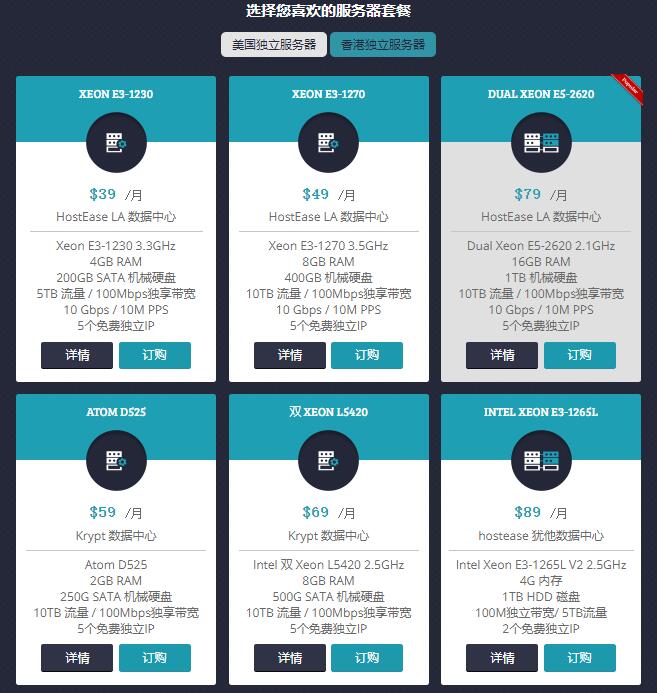 3、配置高端,HostEase美国多IP服务器采用E3、E5系列服务器CPU,提供高达64GB专用内存,百兆独享带宽资源,性能配置好