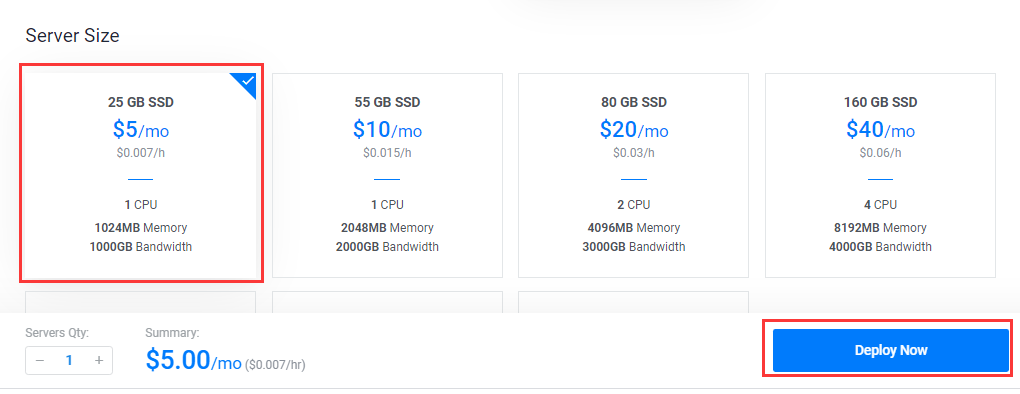 选择最基本的5美元/月,然后直接点击右下的Deploy NOW(立即部署)