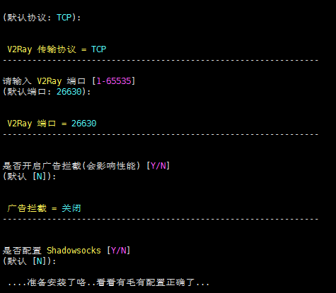 其他的就一路回车就行了。如果要配置Shadowsocks的话,这一步就选择Y。后面的端口,密码啥的根据自己需要修改。